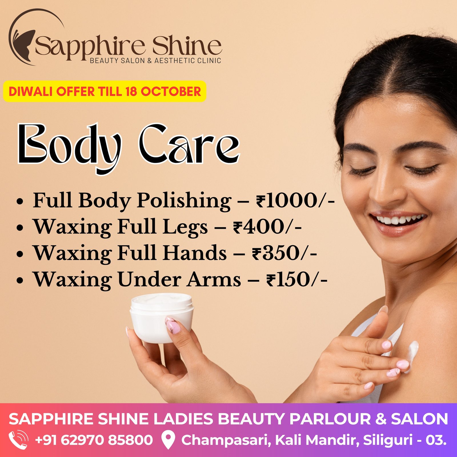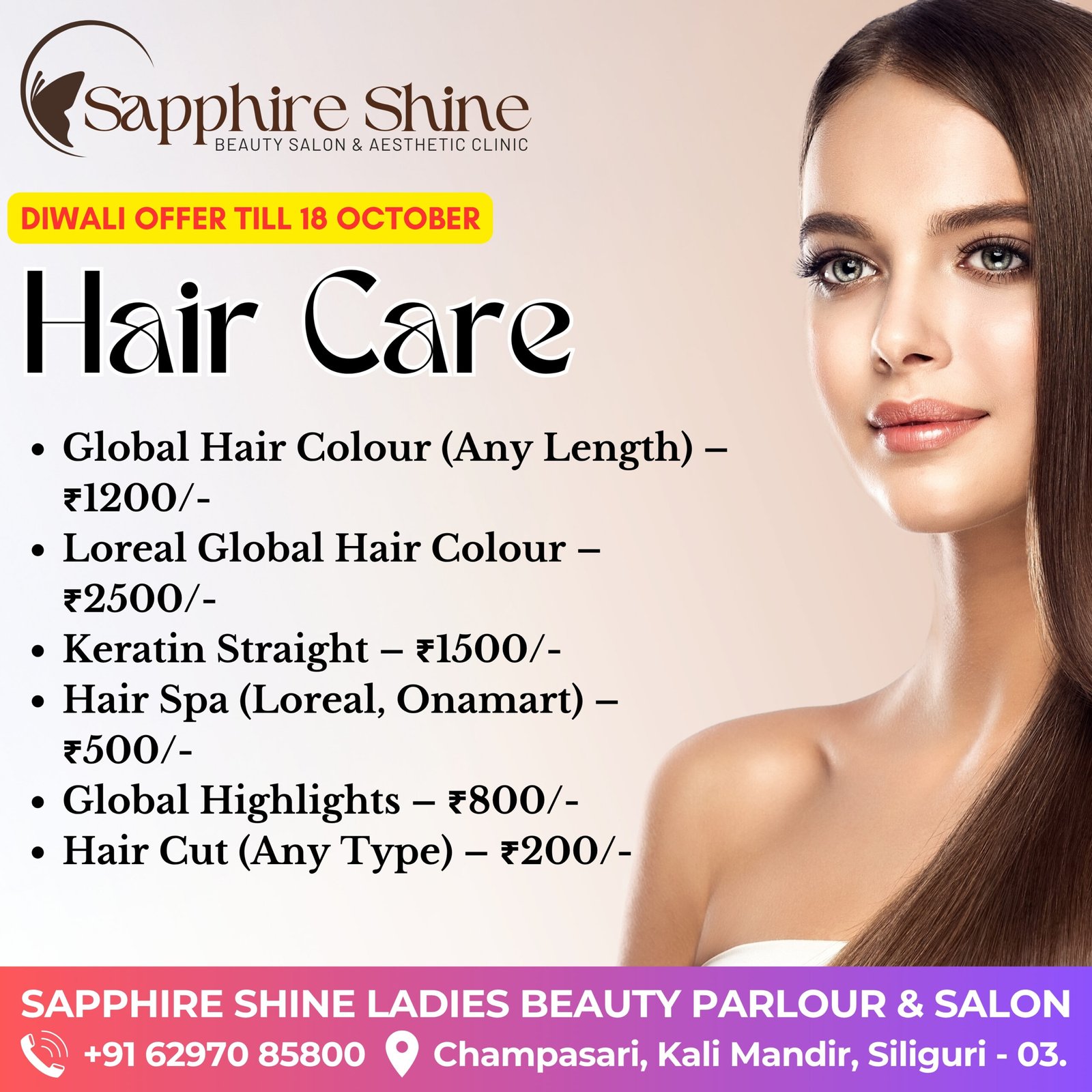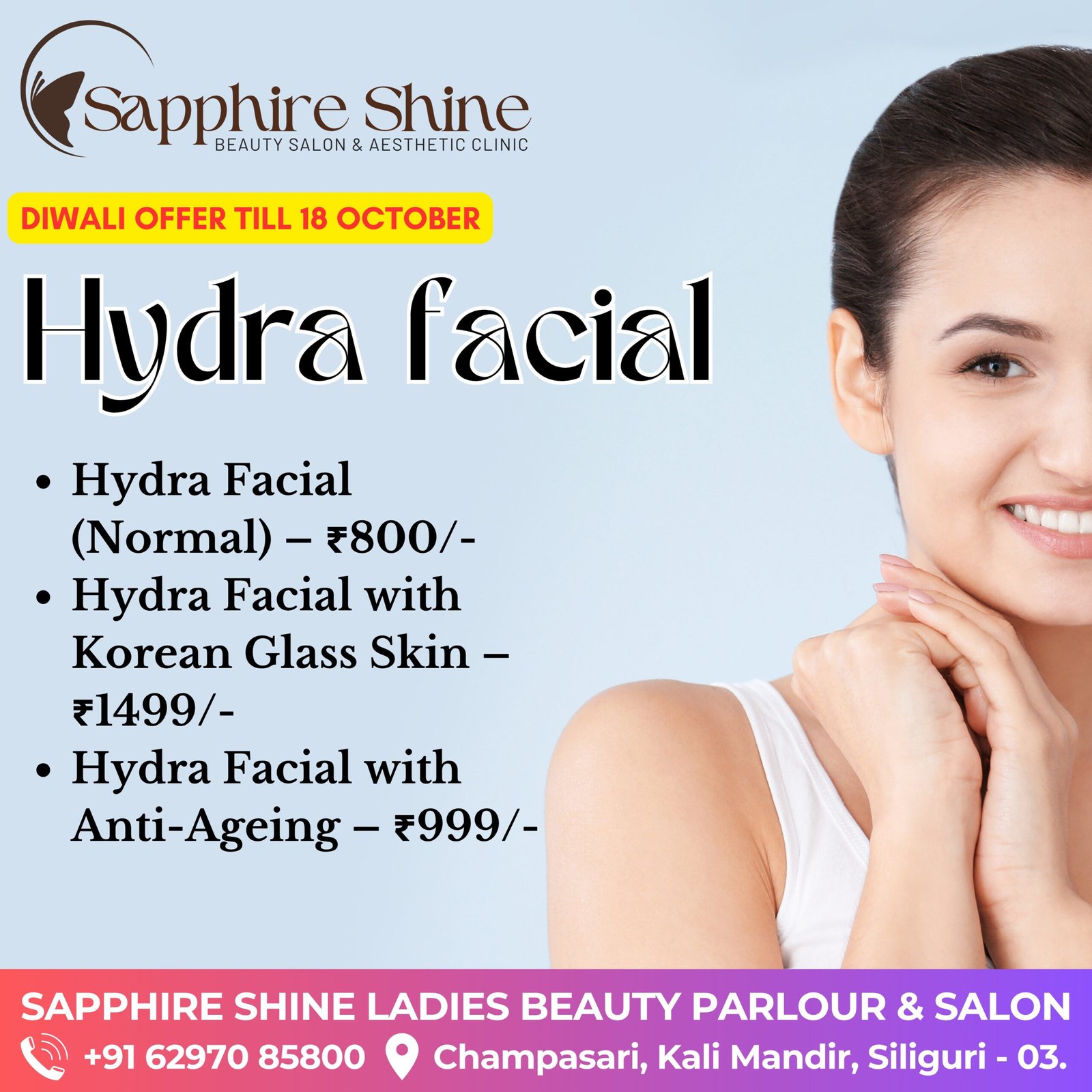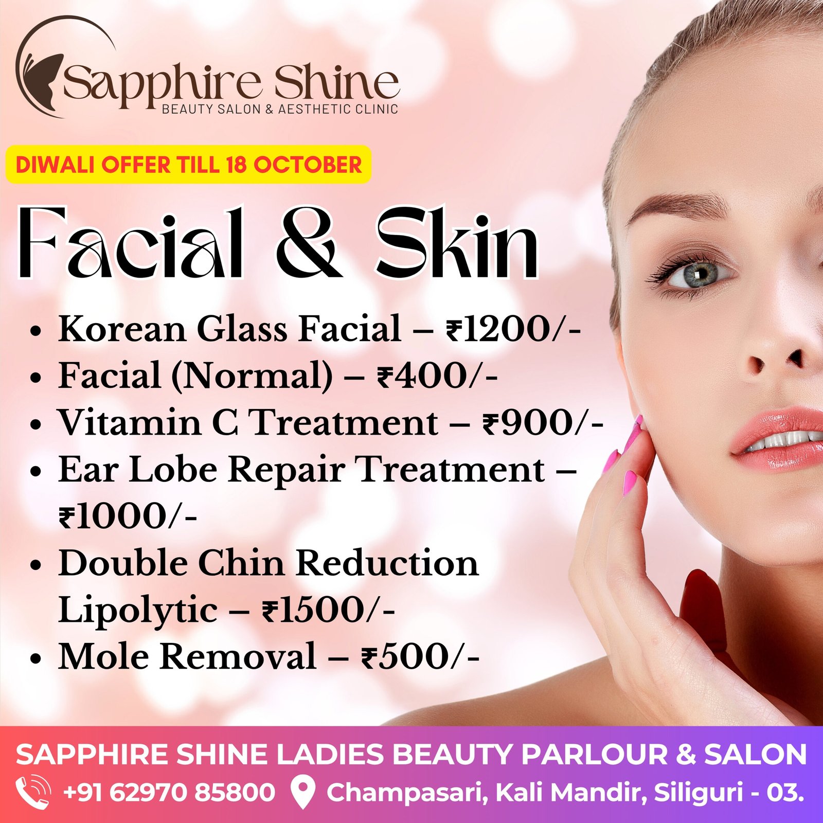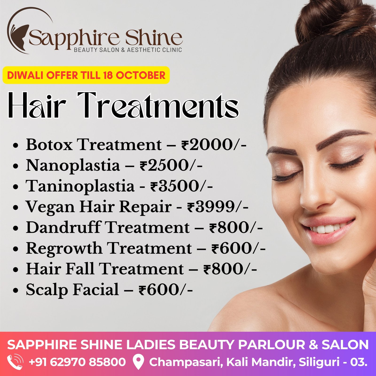 Don’t miss our exclusive Diwali offers! Limited slots are available, so book your festive makeover today and shine brighter than ever this festive season with Sapphire Shine.