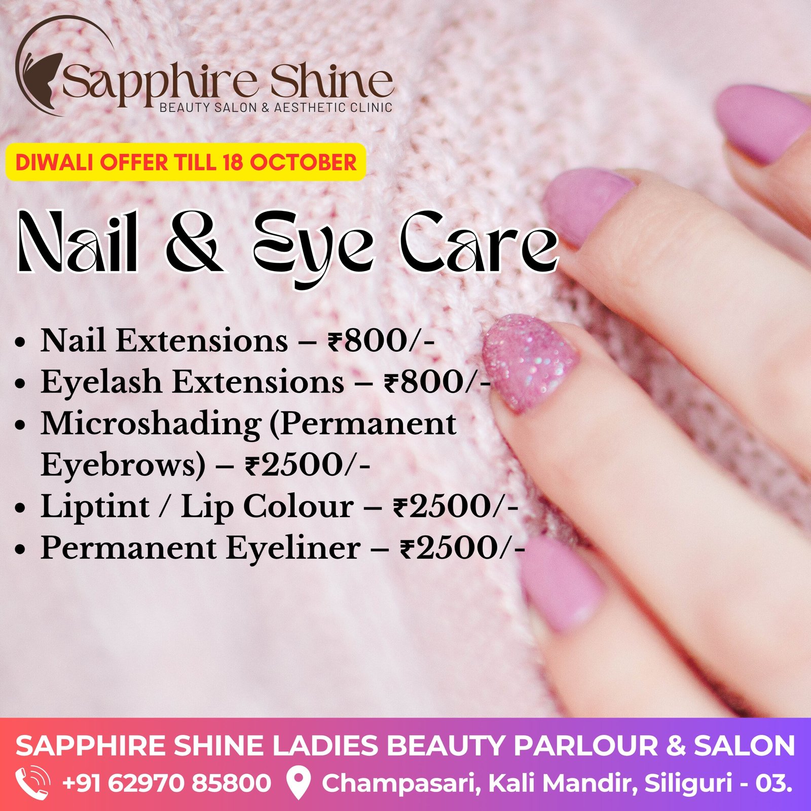 Shine brighter this festive season with Sapphire Shine! Enjoy up to 60% OFF on premium hair, skin, nails, lashes, and PMU services. Book your Diwali makeover now and step out with confidence and glamour.